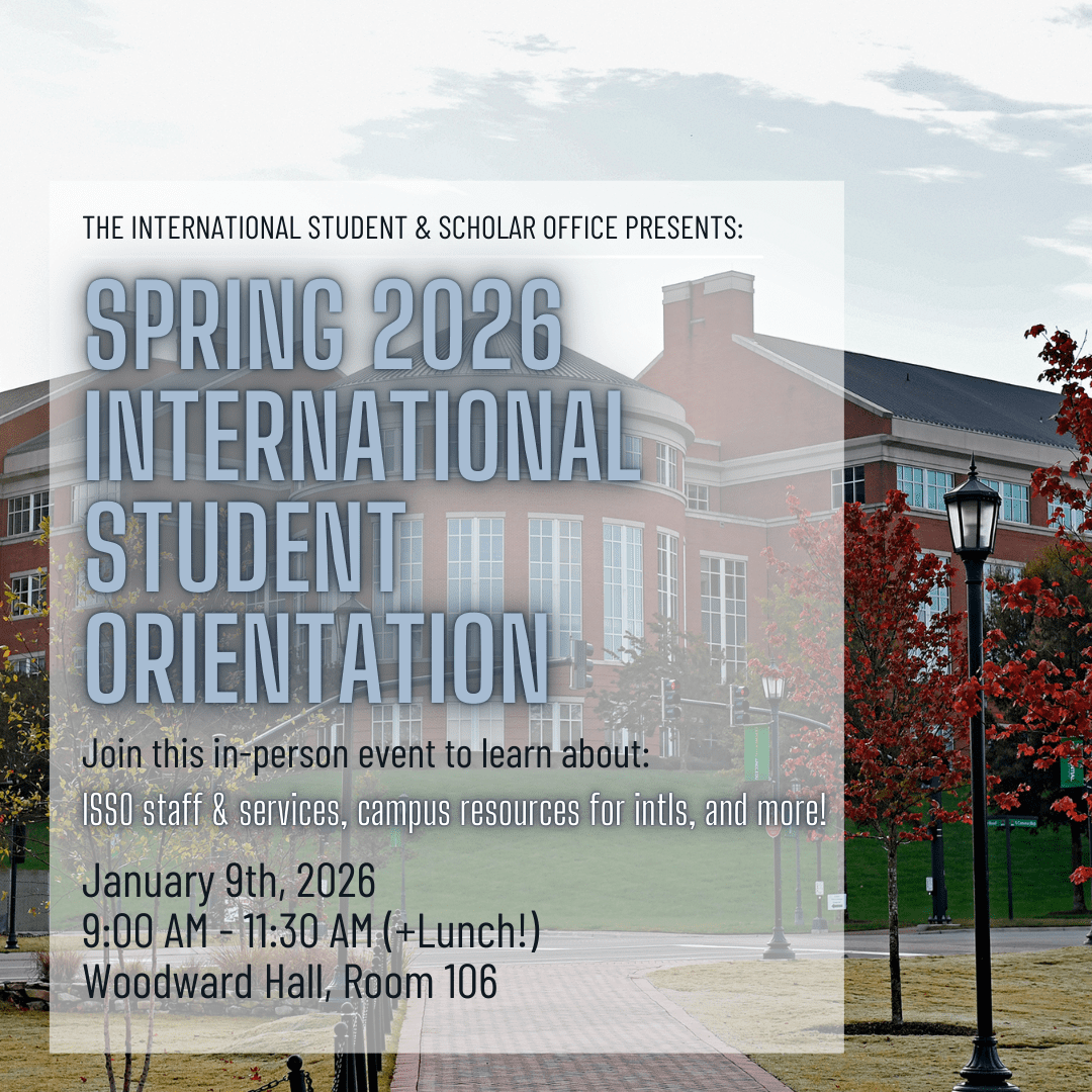• January 9th, 2026: In-Person International Student Welcome Event, Woodward Hall Room 106, 9 AM to 1 PM (lunch at Social 704 included!) .